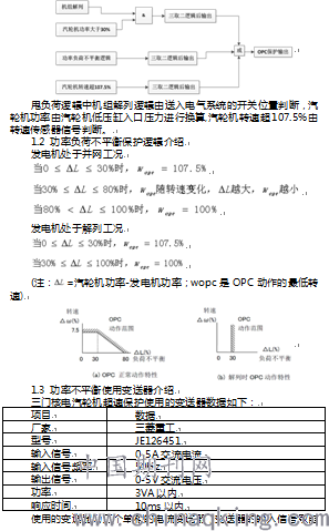 功率负荷不平衡保护是通过检测汽轮机功率与发电机功率的不平衡程度,同时检测实时的转速信号,若满足逻辑条件,会动作汽轮机调阀,将机组稳定。传统的功率负荷不平衡保护一般使用发电机有功功率变送器作为发电机功率输入信号,由于有功功率变送器本身的问题,会造成保护误动作或者响应时间过长。三门核电使用了三菱JE126451作为功率负荷不平衡保护电气量输入,在PLS(电厂控制系统)进行数据换算后,与汽轮机功率作比较,经过逻辑运算后再进行保护输出。