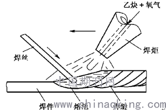气焊与手工电弧焊不同,它是将可燃气体与助燃气体在焊炬混合后引燃后,利用产生的高温火焰作为热源将焊件和焊丝融化,形成熔池待冷却后形成焊缝的一种焊接方法。其原理示意图如图2。