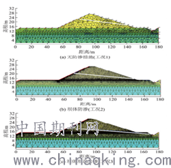 水库围坝地质条件均匀,本文选取设置渗压井的代表断面1+565进行渗流分析。对无防渗、坝体防渗、坝体坝基防渗3种工况分别进行了渗流计算分析。边界条件设定为:上游水位22.73m,下游水位13.00m。浸润线计算结果见图2。