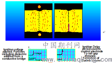 图2(1)  给出了点火电压。电压上升,而打毛液中主要来自添加剂的粒子,开始形成一个贯通导通沟道的传导桥。在此阶段电解质没有传导能力因此没有电流形成。如果电解质中没有这些粒子或者粒子浓度很低,那么导通沟道要比预期的要少得多。