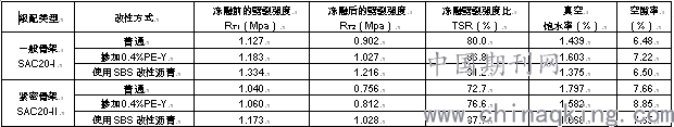 选用一般骨架密实型SAC20-I和紧密骨架密实型SAC20-II两种矿料级配[4],矿料级配如表1所示,针对不进行任何改性的普通沥青混合料、PE-Y(0.4%)改性沥青混合料和SBS(5%)改性沥青混合料等三种混合料,双面击实50 次后成型马歇尔试件,然后在规定试验条件下严格按照试验要求进行冻融劈裂试验,试验结果如表2所示。