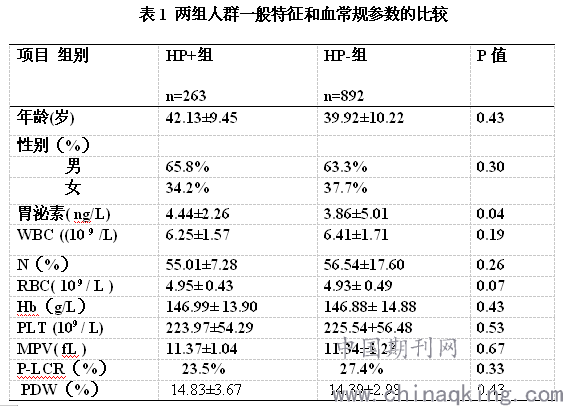 根据血清HP抗体检查结果将263例抗体阳性检查者作为HP+组,892例抗体阴性者作为HP-组,比较两组之间WBC、PLT数量、MPV和大血小板比率等指标有无差别,同时验证两组间血清胃泌素水平差异。