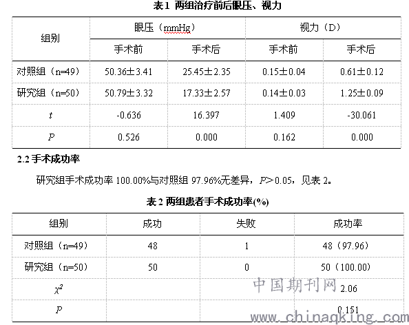 记录患者手术成功情况,其中成功:眼压6-21mmHg,眼压下降≥30%,失败:使用药物也无法控制眼压,需要进一步治疗[3]。