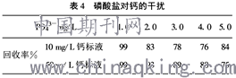 由表 4 可知, 1.0mg/L 以上的PO 3 -4 对钙的测定有负干扰, 尤以低浓度受影响较大。