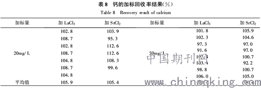 测钙时,加标量为 20~ 50mg/L , 加氯化镧防止干扰, 平均回收率为 102.2%,加氯化锶则为 101.9%。