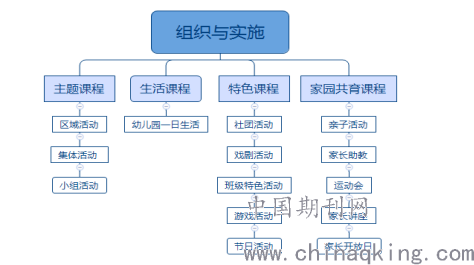 课程组织实施就是把课程内容付诸于实践,是课程体系的重要环节,实施的形式和手段直接影响到课程目标的预期效果。在实施途径上我们结合本园实际情况,借鉴了建构主义、加德纳多元智能、瑞吉欧等教育理念。关注儿童的生活和经验,以活动为载体,以环境为依托,以游戏为手段,通过幼儿对周围世界的深入观察、主动探究、自主体验,尝试和实践活动,促进幼儿健全人格的发展。组织实施体系见图一:
