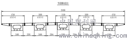 本项目顶面全宽25.5 米,共分为5 个箱室,箱室间由小横梁连接,最外侧设挑臂,所有轴线箱梁沿桥横向均以箱室为单元划分为5 片,其中最外侧挑臂也与箱室一起组成一体,35 米、40 米及42.2 米跨径沿纵向划分为2 个段,即各划分为10 个节段,节段长度根据现场实际选取,60 米跨径沿纵向划分为3 个节段,即各划分为15 个节段,其中9#—10#轴线因要跨越河涌和老桥,拟在内厂分三个节段(纵向)制造,运输至工地现场后将三个节段再接长至5 个约60 米长的节段进行吊装。具体节段划分如下:
