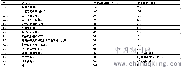采用传统总包项目模式从前期准备到工程开工约需10个月时间,而采用EPC总承包模式业主将设计和施工招标合二为一,编制工程量清单和施工准备的时间可在设计阶段交错进行,建设期间减少和设计单位的重复协调时间。本工程EPC模式相比传统模式,前期准备约减少4个月左右。