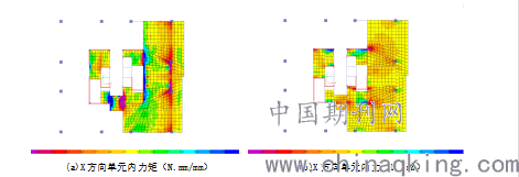 图5给出X方向中震作用组合下二层楼板X方向内力和内力矩分布云图,