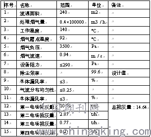 粤泷发电有限公司发电机组锅炉配套的电除尘器为福建省龙净集团公司生产的BE240/2-4/23/405/12.855/8×4G型电除尘器,每台电除尘器处理烟气量为233m³/s,炉膛烟气分二路进入除尘器进口喇叭,在除尘器内部经过分流、折流,再从出口喇叭排入烟道,由二台引风机排出烟囱。技术性能指标如下表: