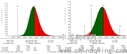 根据此次仿真结果,均值偏移情况,做了工况4仿真分析,假设扶手安装座在工装固定装配的理想情况下,横梁间距1532.5mm的公差由±1mm改为0,同时更改横扶手长度名义值由1450mm改为1450.5mm,间隙名义值由0.75mm改为0.5mm,分析结果如图14所示:间隙的超差率由工况2的19.28%和工况3的19.62%,提高至16.74%。均值由0.37提高至0.5377,相对于(0-1)mm的检测标准来说更为合理,出现干涉和间隙过大的概率明显下降,更有利于现场装配,提高产品质量。分析结果对比见表2。