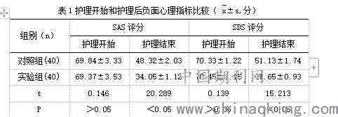 护理开始两组负面心理指标比较,P>0.05,而护理结束实验组负面心理指标优化程度大于对照组优化的程度,P<0.05。如表1.
