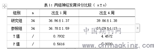研究组出生4周神经发育评分优于参照组,P<0.05。如表1所示。