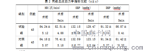 术前,两组HR、SBP、DBP比较,差异无统计学意义(P>0.05);术后5 min试验组HR、SBP、DBP均高于对照组,差异有统计学意义(P<0.05),见表2。