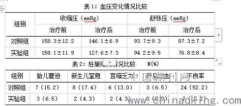 46例实验组产妇给予酚妥拉明、硝苯地平联合硫酸镁治疗,具体操作方法如下:⑴硫酸镁使用情况与对照组一致;⑵使用20g酚妥拉明与5%葡萄糖注射液联合使用,取250ml的葡萄糖溶液充分混合并进行静脉滴注,确保半个小时滴入10mg,随后根据产妇的血压情况进行调整[5];⑶硝苯地平每天口服三次,每次10mg,7天为一个治疗周期[6]。
