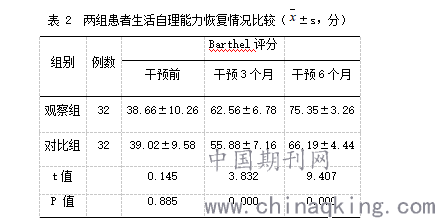 表 2 两组患者生活自理能力恢复情况比较(±s,分)