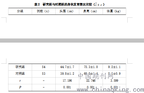 研究组头围为(44.7±1.7)cm,身高为(75.3±1.8)cm,体重为(9.2±1.1)kg,均优于对照组,差异有统计学意义(P<0.05)。详细见表2: