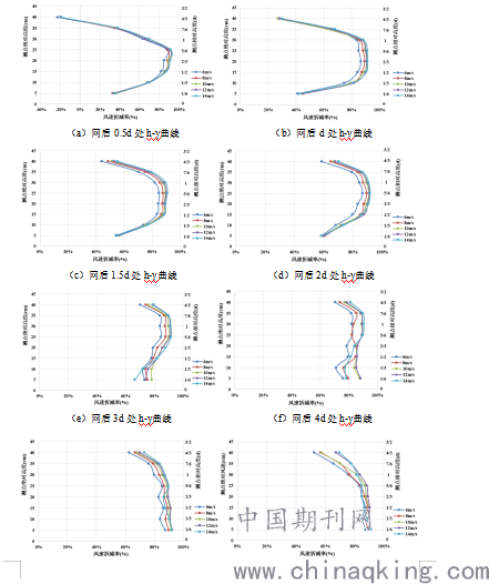 纵观整个试验段内所有断面的h-γ曲线可发现,高风速时的曲线基本都会包络低风速时的曲线,因此可知:风速越大防风网的减风效果越好。这一结论在网后0.5d至2d、6d至20d范围内较明显;