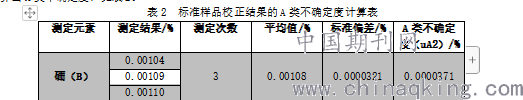 按照测定方法,将低硼含量的标样进10次测量,同时进行统计计算,按照式(1)计算出A类不确定度,结果见表1。