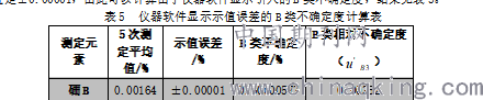 通过以上计算可以得出如下结论:本次使用火花直读光谱仪对低合金钢中微量硼元素进行测定,并且大胆的提出使用微量硼元素的标样来校准空白值,并且计算了不确定度;该实例的计算,可以推广到一般仪器分析领域中的不确定度计算,对其他分析方法的不确定度计算也有一定的示范作用;本次实例计算,将相对B类不确定度概念引入到直读光谱仪测定低合金钢中的硼含量的不确定度计算中。使得计算更为便捷、实用。