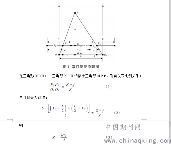 如图1所示,P为所要测距的目标,长为L的两线段代表左右相机的像面,OL和OR是左右两相机的光心,PL和PR是目标P在左右像面上的成像点,XL和XR是PL和PR距各自像面左边缘的距离,基线b是两相机光心的距离,f是两相机的焦距。