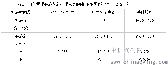实施细节管理后,护理人员的安全识别能力、风险防范意识、基础服务水平三项能力指标评分均明显高于实施前,两组数据存在明显差异性(P<0.05)。见表1: