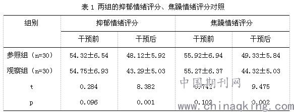 接受护理干预前,对两组产妇的抑郁情绪评分、焦躁情绪评分进行组间对比,差异不存在统计学意义(P>0.05)。接受护理干预后,两组产妇的抑郁情绪评分、焦躁情绪评分均明显降低(P<0.05),且两组组间对比,差异存在统计学意义(P<0.05),与参照组相比较,观察组产妇的抑郁情绪评分、焦躁情绪评分显著降低(P<0.05)。如表1所示。