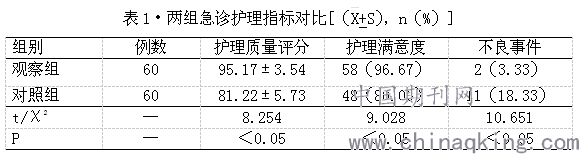 采用自制调查问卷,对两组急诊护理质量进行评价,计算两组护理满意度,记录两组不良事件发生情况。