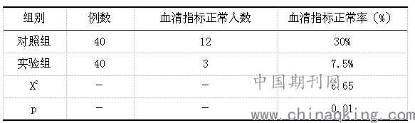 由表1可见,实验组患者治疗后的血清指标正常率明显高于对照组患者,差异具有统计学意义(p<0.05)。