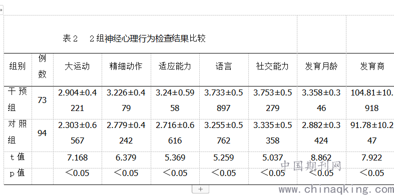 本研究显示,早产儿较正月龄3个月时,干预组神经系统异常项目检出率明显低于对照组,在发育各能区的评估中,干预组在适应性、大运动、精细动作、语言、社交行为等各能区的发育月龄及发育商明显高于对照组,有显著的统计学意义(P<0.05)