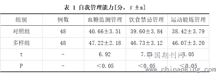 对照组血糖监测管理(40.66±3.51)分、饮食禁忌管理(39.60±3.84)分、运动锻炼管理(38.42±3.79)分,均低于多样组(P<0.05)。