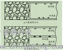 A矿井下通风原设计采用U型通风方式,但这种通风方式在A矿的生产实际使用中存在诸多不足,例如上隅角涡流无法彻底消失、回采面作业环境差、采空区漏风量大、双煤巷布设方式不便于瓦斯抽采等。针对这些存在的问题,设计选用W型通风方式对原有通风系统进行优化改良。W型通风为一进两回或两进一回通风系统,具有通风阻力小、漏风量少、可有效抑制瓦斯涌出等优点。图1即为优化前后两种通风方式示意图。