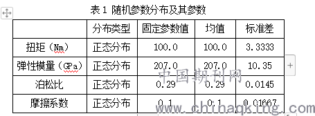 根据减速器齿轮工作状态,考虑负载扭矩、材料弹性模量、泊松比和齿面接触摩擦系数等随机因素的影响,基于响应面法计算齿轮齿根强度可靠度。随机参数均假设服从正态分布,其特征参数见表1。