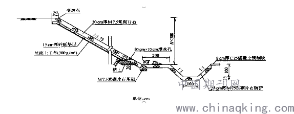 (5)浆砌片石下铺设15cm厚砂砾垫层,在垫层下铺一层反滤土工布;