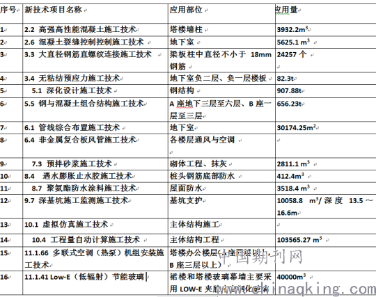 创优工程应积极推广应用新技术、新工艺。本工程在施工过程中涉及新技术面广,应用项目较多,在施工中推广应用了建设部推广的“建筑业10项新技术”中的8项,共16个子项。均取得良好的质量效果及经济效益。见表1