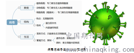 病毒是由一个核酸分子(DNA或RNA)与蛋白质构成的非细胞形态的靠寄生生活的生命体。教师可借助影音视频和PPT为引课载体,运用思维导图,建构初中生物的病毒知识点。通过具有实事性与代表性的病毒知识作为设计主题,学生可借助简短性、提示性、多样性的微课视频、桌面背景提示或图文导学等学习资源,以探究生命科学的问题为支点,引导学生在探究中寻求学科知识的突破点与创意设计的立足点。