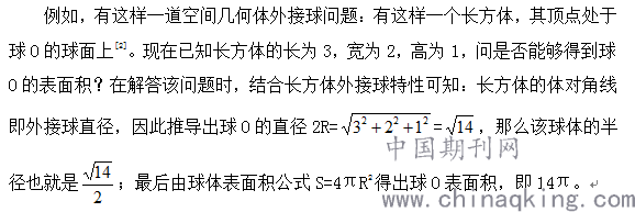 有一些几何体存在特殊性,所以在解决该类空间几何体外接球问题时,可以引导学生利用其特殊性质进行解题。比如利用长方体与球体的对称性质,能够得到长方体的体对角线即外接球直径,进而轻松、准确地解决相关问题。