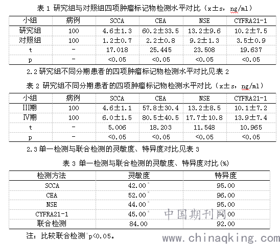 (1)对比对照组与研究组(包括Ⅳ期、Ⅲ期)SCCA、CEA、NSE、CYFRA21-1水平;(2)对比单一检测、联合检测的灵敏度、特异度。