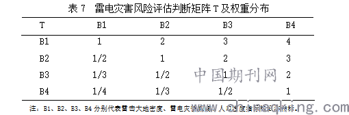 表7 雷电灾害风险评估判断矩阵T及权重分布