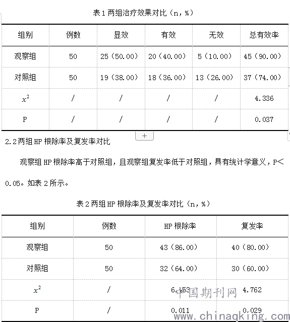 疗效评定标准:显效:经过治疗患者上腹部疼痛的症状基本消失,经过胃镜检发现其溃疡已消失;有效:经过治疗患者上腹部疼痛的症状有所改善,经过胃镜检查发现其溃疡有明显愈合;无效:经过治疗患者上腹部疼痛的症状没有发生变化,经过胃镜检查发现其溃疡没有愈合。总有效率=(显效+有效)/总例数*100%。两组治疗后对其HP根除率进行记录并对比,另外1年后对其复发率进行随访并记录。