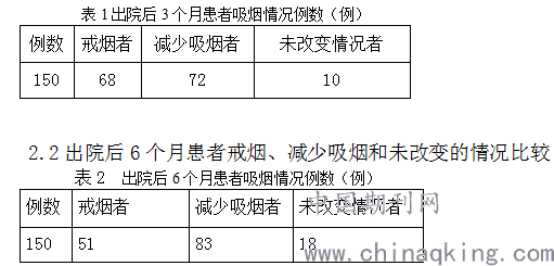 通过发放调查问卷的方式,了解患者住院前吸烟情况,比如:年龄、职业、性别、收入、婚否、每日吸烟量、吸烟年龄、一般治疗、是否戒过烟等进行收集。患者出院后3个月、6个月分别进行回访一次,了解患者出院后吸烟情况、周围吸烟环境、再次吸烟的原因和时间。