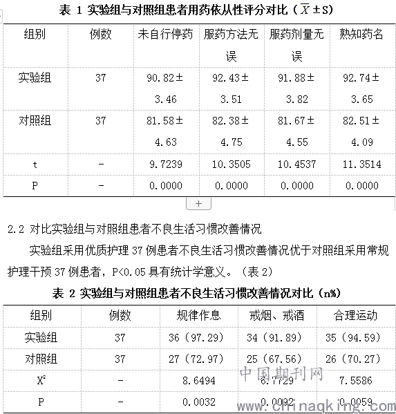实验组患者采用优质护理,其具体护理措施如下:(1)用药前护理,医护人员对患者及家属讲述药物治疗的作用、目的、意义,同时向其讲解用药剂量、用药方法及用药后可能出现不良反应,长期服药的重要性,从而减轻患者恐慌心理,可以按量进行服药。(2)用药中护理,医护人员嘱咐患者在早晨起床后进行空腹服药,医护人员在患者服药后密切观察其服药后不良反应发生情况,对患者不良反应发生时间、不良反应程度进行观察,根据不良反应发生情况适当调整用药方法。(3)随访监督,医护人员在患者住院期间监督其用药情况,在患者出院后医护人员通过电话、短信、微信等形式提醒患者准时服药,使用正确方法服药,询问患者的服药情况,同时嘱咐患者定期进行复查,医护人员对检查结果进行追踪,根据检查结果给予患者针对性指导。(4)纠正患者不良生活习惯,医护人员对患者法进行思想教育,给予患者提供营养学建议,嘱咐患者可适当进行锻炼,如慢跑、打太极、散步等有氧运动运动。