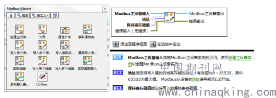 新建VI文件,打开Modbus Master函数栏,如图4左所示,该栏包含了ModBus服务器的全部函数。选用创建主设备函数,选择新建TCP主设备,输入PLC的IP地址和端口号(502),连接读取输入寄存器、写入线圈等业务函数,最后连接错误输出函数,在界面监视网络状态。如图4右所示,为写入单个保持寄存器函数,需要输入的参数主要有ModBus主设备数据流、地址和待写入寄存器值,需要注意的是地址的数据范围为0-65535,而PLC表中的地址为6位(如400001),此时需要进行转换。