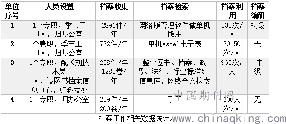 3.2表中选择了5组统计参数:人员设置、档案采集、档案检索、档案利用、档案编研。档案利用量、档案采集量反映目前社会经济发展和单位活动状况;人员设置情况及归口,影响档案采集的完整即单位对工作总结的程度;档案检索信息化程度表现档案利用的速度和广度;档案编研涉及到档案工作的服务档次和档案管理的专业研究水平,因此具有代表性。