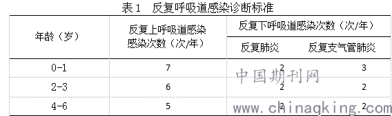 (1)纳入标准:根据 2008 年中华医学会儿科学分会呼吸组提出的诊断准诊断为反复呼吸道感染;纳入年龄0岁~6岁;患儿至少随访1年;所有参与者患儿家长均知情,且同意参与本次研究。(2)排除标准:近3个月补充维生素A及使用激素类相关药物;存在免疫系统及血液系统疾病患儿;失访、放弃治疗或未再来某院继续治疗;合并先天性哮喘;合并消化道疾病。(3)诊断标准:反复呼吸道感染诊断根据2007年反复呼吸道感染诊断标准的修订建议判断标准,见表 1。
