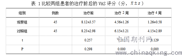 治疗前,两组患者的VAS评分相比差异无统计学意义(P>0.05),治疗后,观察组的VAS评分低于对照组(P<0. 05),见表1。