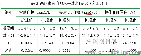 表2 两组患者血糖水平对比[n=50(±s)]