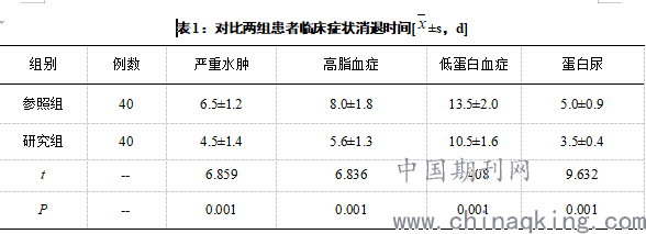 比较患者临床症状消退时间,临床症状主要包括严重水肿、高血脂症、低蛋白血症、蛋白尿等。