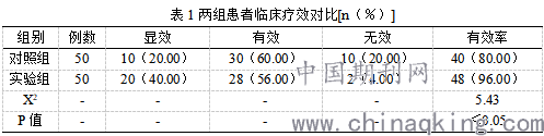 观察组患者临床治疗有效率为96.00%,显著高于对照组患者的80.00%,数据差异显著(P<0.05),详见表1。
