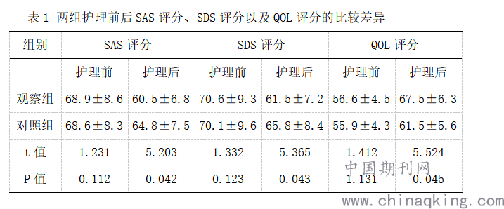 两组患者护理前SAS评分、SDS评分以及QOL评分的比较差异均无统计学意义,但观察组护理后SAS评分、SDS评分以及QOL评分均明显优于对照组(P<0.05),见表1。